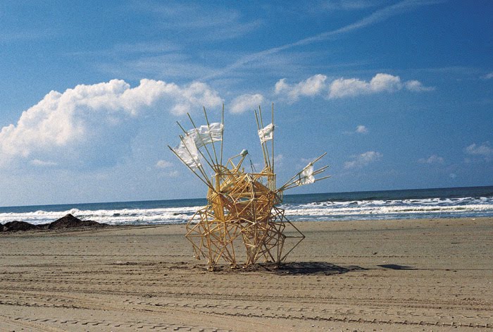 Theo Jansen has released his creatures in England before, when one was set loose in Trafalgar Square during his 2006 at the ICA in London, but to my knowledge, this will be the first time that they have trod the sands of a British beach. And the beach is, after all, the environment for which they have been fashioned. The particular genus or species which Jansen has created for the occasion is known as the Ventosa Siamesis, and is some 10 metres long. There will also be a smaller creature with which the public will be able to interact. Jansen himself will be in attendance on Saturday and Sunday from 3-5 in the afternoon, and there is a further opportunity to hear him give a talk and demonstrate his methods at 7 in the evening at Exeter Central Library on Friday 2nd July. As for those heading for the beach with no prior knowledge of what they’re about to encounter, they’re in for a big surprise.